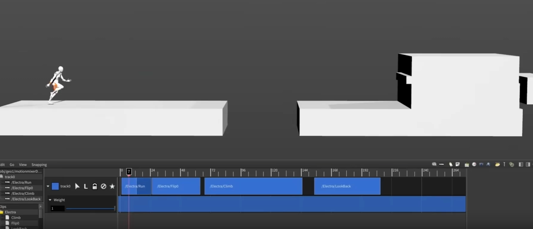 모션 믹서는 타임라인 기반 뷰에서 여러 캐릭터의 애니메이션 클립을 결합하고 편집할 수 있게 해줍니다. 또한 추가 효과를 적용해 최종 애니메이션의 **연출(룩)**과 **동작 특성(행동/거동)**을 변화시킬 수도 있습니다.