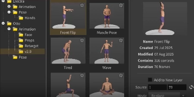 애니메이션 카탈로그는 애니메이션 씬에 애니메이션 클립과 단일 프레임 포즈(포즈 한 컷)를 저장·관리·적용할 수 있게 해주는 기능으로, 서로 다른 프로젝트에서도 애니메이션을 재사용할 수 있도록 해줍니다.